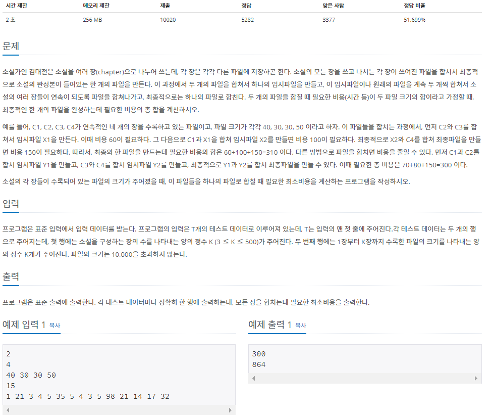 3중 for 문을 활용하여 풀어야 하는 동적 프로그래밍 문제이다. 파일은 연속되는 것들만 합치기가 가능하며, 파일을 계속 합치며 도출 되는 비용이 최소가 되도록 알고리즘을 구성해야 한다.
