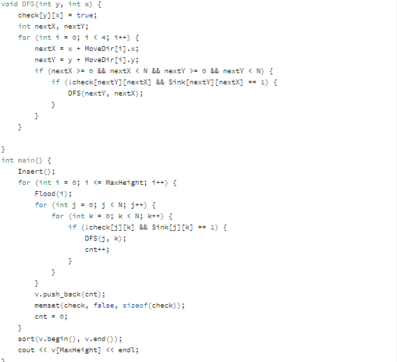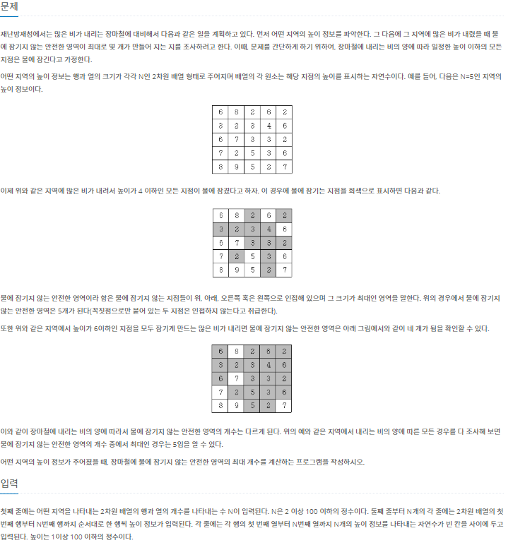 NxN 행렬의 지역 높이 데이터 정보를 입력받아, 침수된 지역을 제외한 안전 영역의 수를 DFS 를 통해 구하는 기본적인 형태의 DFS 문제이다. 침수된 지역을 제외시켜 준후, DFS 알고리즘에 지역 데이터를 넣어주면, 안전 영역을 도출할 수 있다.