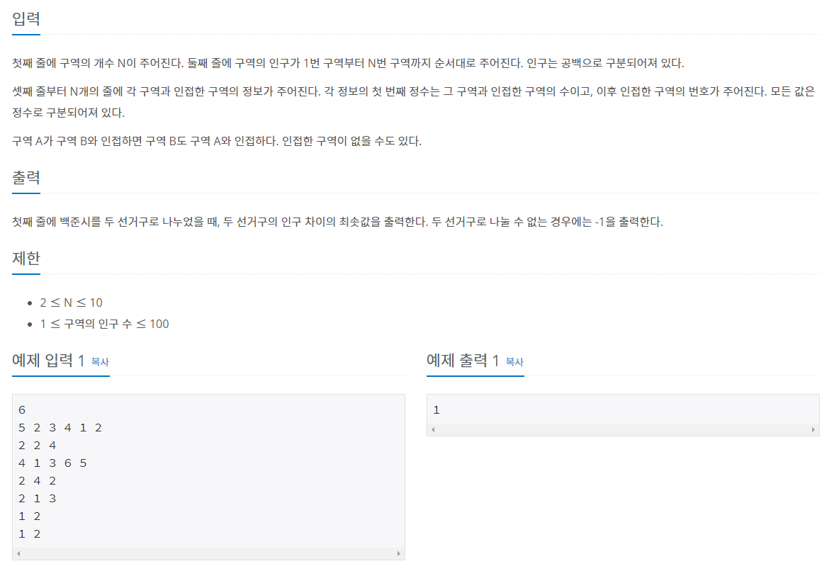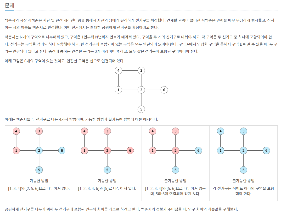 선거구를 [1, 4], [2, 3, 5, 6]으로 나누면 각 선거구의 인구는 9, 8이 된다. 인구 차이는 1이고, 이 값보다 더 작은 값으로 선거구를 나눌 수는 없다.