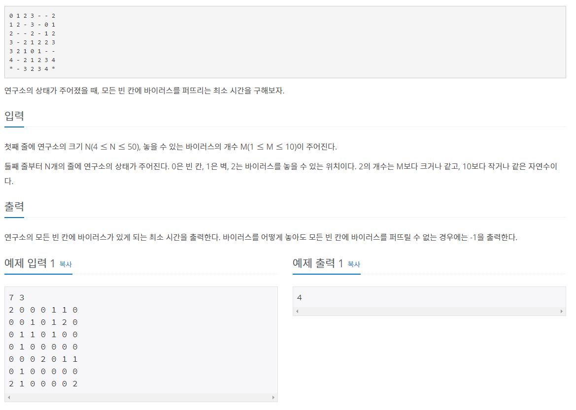 연구소 문제 시리즈 중 마지막이 아닐까? 바이러스의 개수 중 M개를 선택하여 BFS를 진행하면된다.