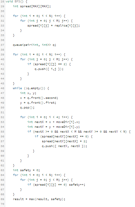 BFS 개념을 사용하기 위하여 큐를 선언한다. 벽이 세워진 후 복제된 배열인 replica 의 정보를 바이러스가 퍼진후의 데이터를 도출하기 위해 spread 행렬에 대입하고, queue 에 바이러스의 위치를 넣는다. 이후, BFS 의 기본 형태에 따라 큐가 완전히 비워질 때 까지 while 문을 반복하여 바이러스가 퍼진후의 배열을 도출하고, 이후 안전영역의 개수를 구하고 max 함수를 사용하여 최고값을 갱신한다.