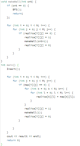재귀함수를 사용하여, 복제 배열 내부에 벽이 3개 세워질 때 까지 함수를 반복하고 벽이 3개 세워졌다면 BFS 함수를 실행시킨다.