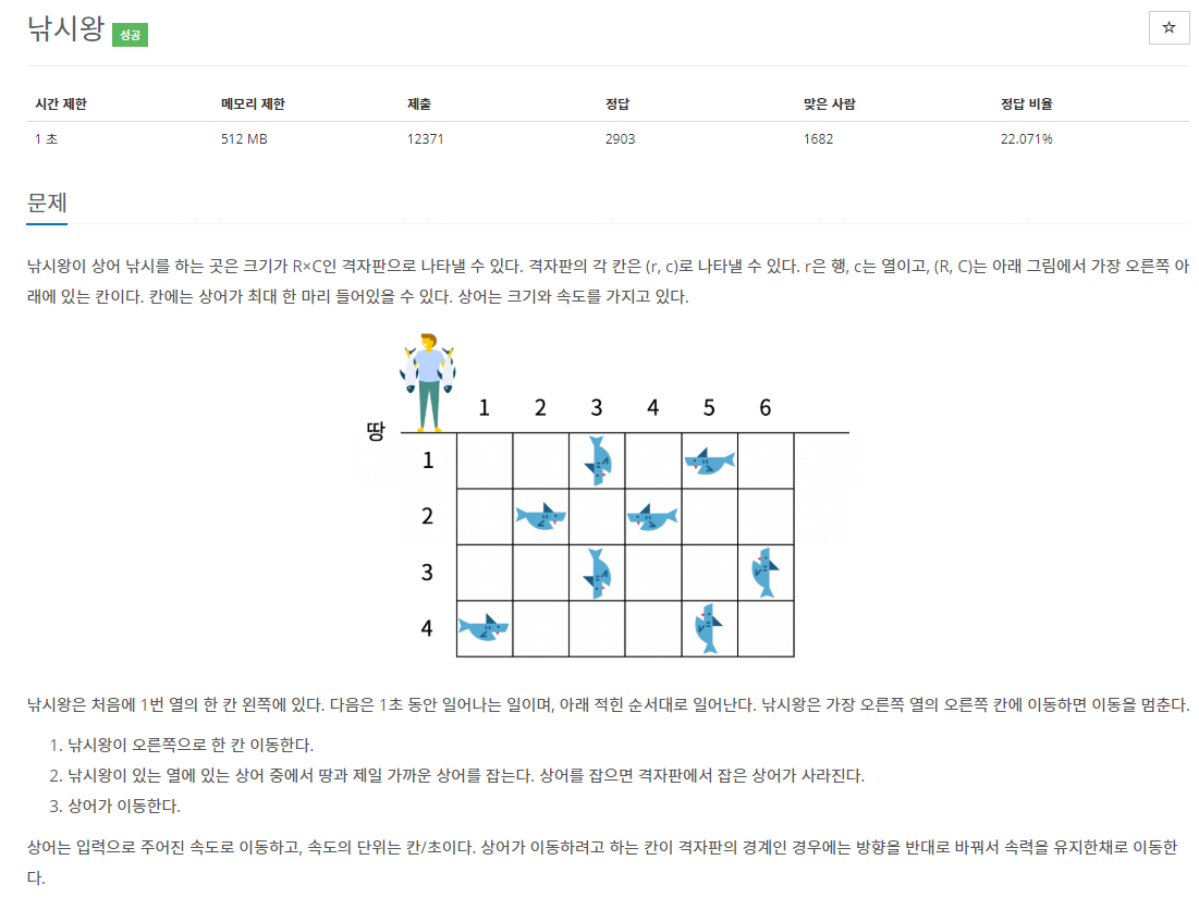 낚시왕이 상어 낚시를 하는 곳은 크기가 R×C인 격자판으로 나타낼 수 있다. 격자판의 각 칸은 (r, c)로 나타낼 수 있다. r은 행, c는 열이고, (R, C)는 아래 그림에서 가장 오른쪽 아래에 있는 칸이다. 칸에는 상어가 최대 한 마리 들어있을 수 있다. 상어는 크기와 속도를 가지고 있다. 낚시왕은 처음에 1번 열의 한 칸 왼쪽에 있다. 다음은 1초 동안 일어나는 일이며, 아래 적힌 순서대로 일어난다. 낚시왕은 가장 오른쪽 열의 오른쪽 칸에 이동하