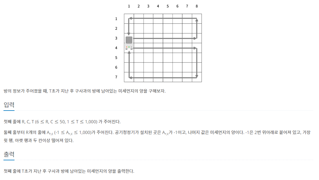 미세먼지를 제거하기 위해 구사과는 공기청정기를 설치하려고 한다. 공기청정기의 성능을 테스트하기 위해 구사과는 집을 크기가 R×C인 격자판으로 나타냈고, 1×1 크기의 칸으로 나눴다. 구사과는 뛰어난 코딩 실력을 이용해 각 칸 (r, c)에 있는 미세먼지의 양을 실시간으로 모니터링하는 시스템을 개발했다. (r, c)는 r행 c열을 의미한다. 공기청정기는 항상 왼쪽 열에 설치되어 있고, 크기는 두 행을 차지한다. 공기청정기가 설치되어 있지 않은 칸에는 미세먼