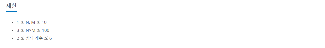 첫째 줄에 지도의 세로 크기 N과 가로 크기 M이 주어진다. 둘째 줄부터 N개의 줄에 지도의 정보가 주어진다. 각 줄은 M개의 수로 이루어져 있으며, 수는 0 또는 1이다. 0은 바다, 1은 땅을 의미한다.