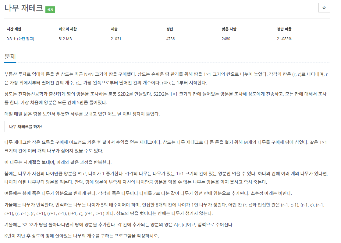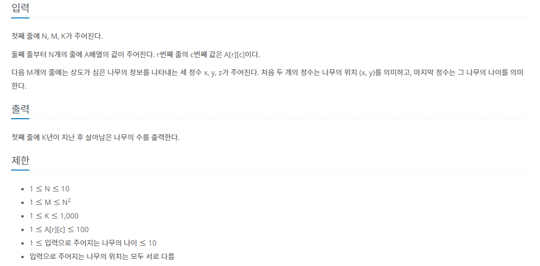 할짓없는 친구가 NXN 땅을 사서 나무를 키우는 문제이다. 로봇도 사서 매년 겨울에 양분도 주고,