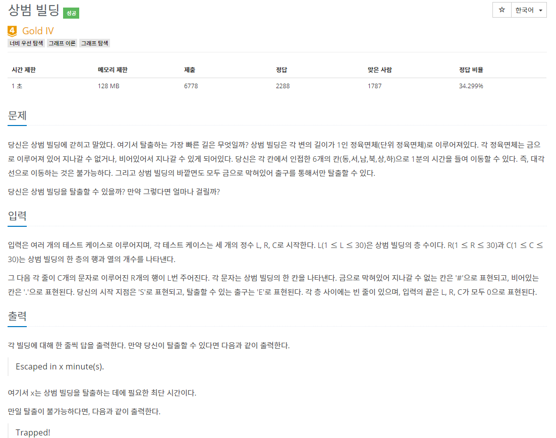문제 당신은 상범 빌딩에 갇히고 말았다. 여기서 탈출하는 가장 빠른 길은 무엇일까? 상범 빌딩은 각 변의 길이가 1인 정육면체(단위 정육면체)로 이루어져있다. 각 정육면체는 금으로 이루어져 있어 지나갈 수 없거나, 비어있어서 지나갈 수 있게 되어있다. 당신은 각 칸에서 인접한 6개의 칸(동,서,남,북,상,하)으로 1분의 시간을 들여 이동할 수 있다. 즉, 대각선으로 이동하는 것은 불가능하다. 그리고 상범 빌딩의 바깥면도 모두 금으로 막혀있어 출구를 통해서