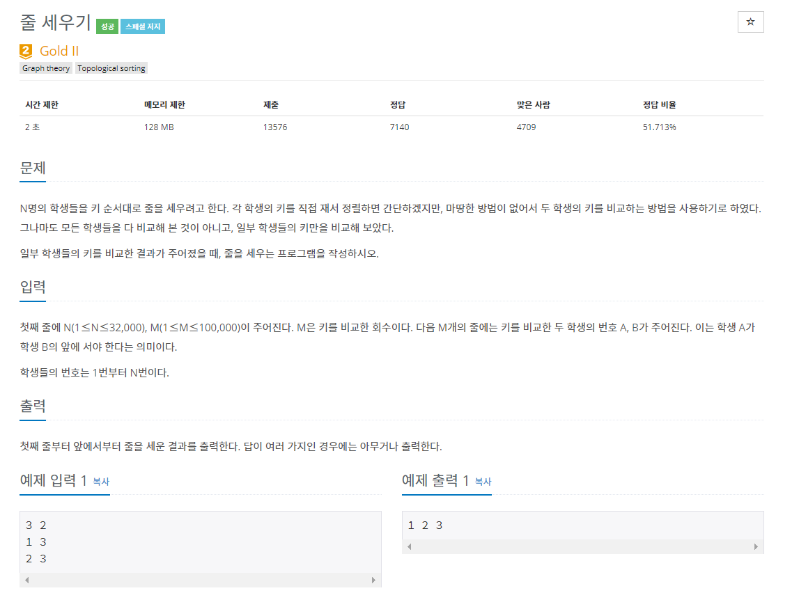 첫째 줄에 N(1≤N≤32,000), M(1≤M≤100,000)이 주어진다. M은 키를 비교한 회수이다. 다음 M개의 줄에는 키를 비교한 두 학생의 번호 A, B가 주어진다. 이는 학생 A가 학생 B의 앞에 서야 한다는 의미이다. 학생들의 번호는 1번부터 N번이다.