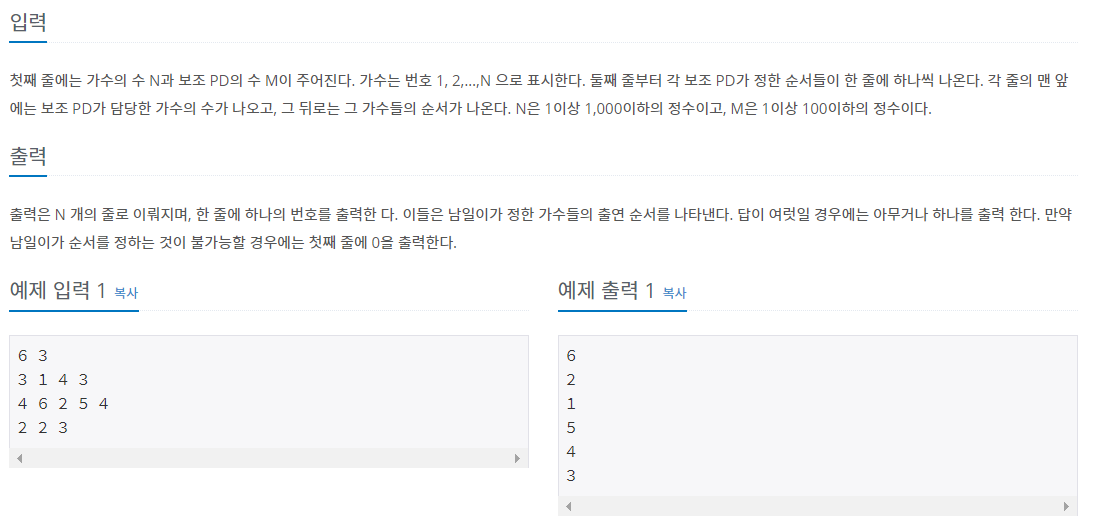 첫째 줄에는 가수의 수 N과 보조 PD의 수 M이 주어진다. 가수는 번호 1, 2,…,N 으로 표시한다. 둘째 줄부터 각 보조 PD가 정한 순서들이 한 줄에 하나씩 나온다. 각 줄의 맨 앞에는 보조 PD가 담당한 가수의 수가 나오고, 그 뒤로는 그 가수들의 순서가 나온다. N은 1이상 1,000이하의 정수이고, M은 1이상 100이하의 정수이다.