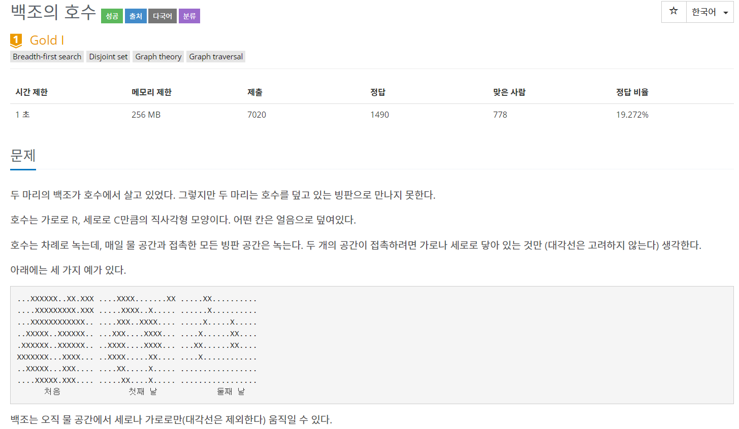 문제 두 마리의 백조가 호수에서 살고 있었다. 그렇지만 두 마리는 호수를 덮고 있는 빙판으로 만나지 못한다. 호수는 가로로 R, 세로로 C만큼의 직사각형 모양이다. 어떤 칸은 얼음으로 덮여있다. 호수는 차례로 녹는데, 매일 물 공간과 접촉한 모든 빙판 공간은 녹는다. 두 개의 공간이 접촉하려면 가로나 세로로 닿아 있는 것만 (대각선은 고려하지 않는다) 생각한다. 아래에는 세 가지 예가 있다. ...XXXXXX..XX.XXX ....XXXX.......XX