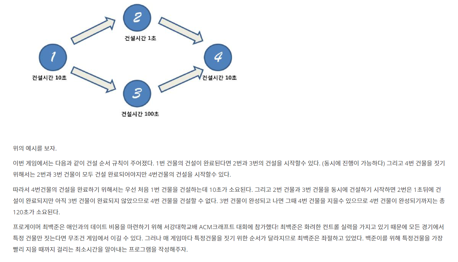 빌드와 시간이라는 개념이 등장하여 1 ->2 ->3 , 11->10->3 의 노드 연결정보에서