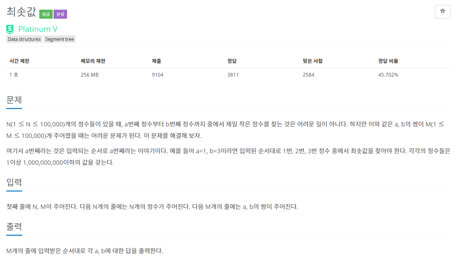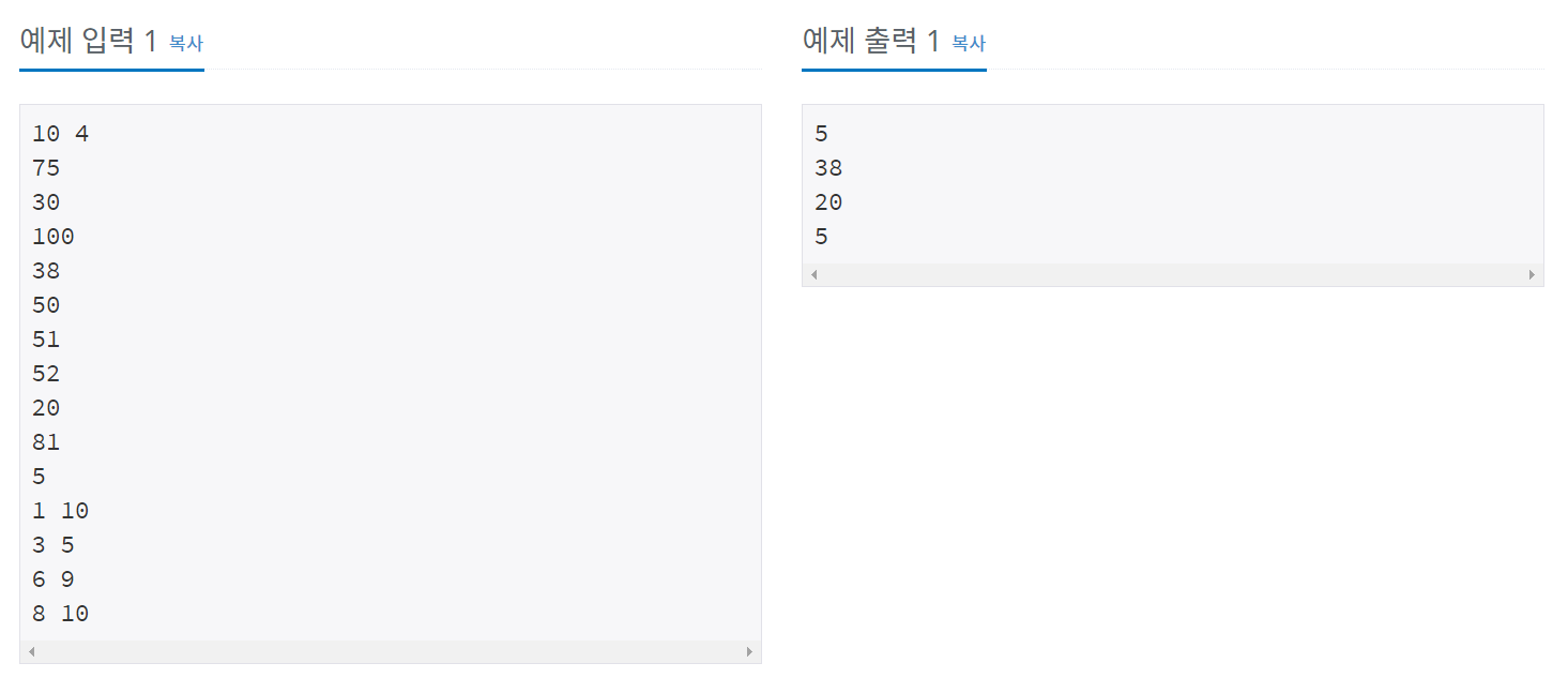 N(1 ≤ N ≤ 100,000)개의 정수들이 있을 때, a번째 정수부터 b번째 정수까지 중에서 제일 작은 정수를 찾는 것은 어려운 일이 아니다. 하지만 이와 같은 a, b의 쌍이 M(1 ≤ M ≤ 100,000)개 주어졌을 때는