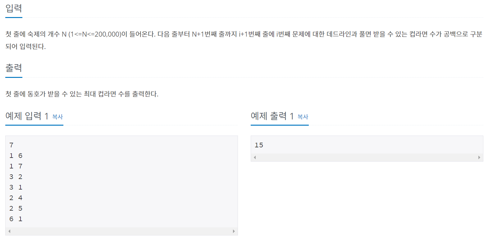 각 데드라인이 정해져있는 문제에서 최대한 많은 컵라면을 받으며 문제를 풀었을때 받을수있는 컵라면의