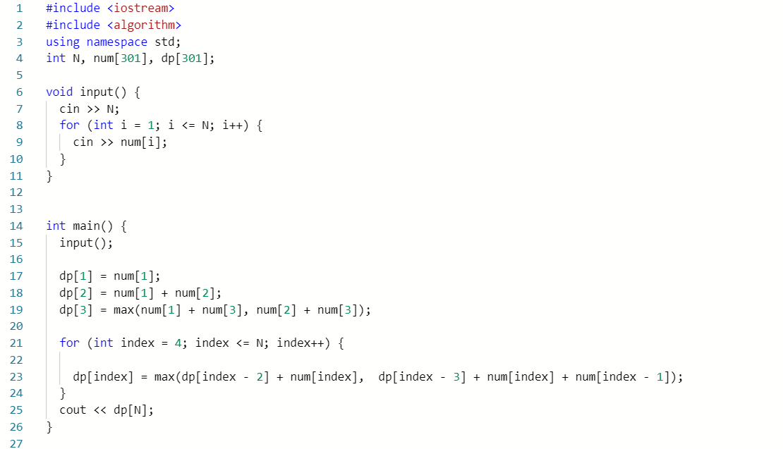 즉 dp[n]값을 구하기위해서 dp[n-2] + num[n] 값과 dp[n-3] + num[n-1] + num[n-2] 값중 큰값으로 업데이트해주면서 진행하면된다.