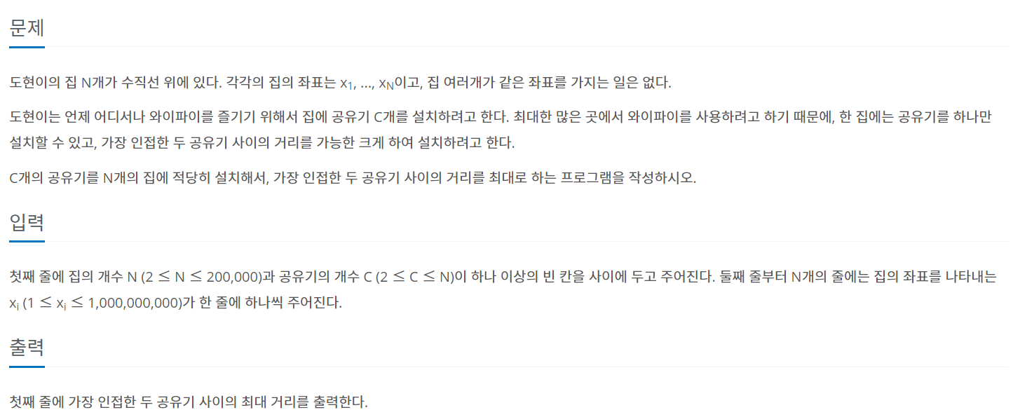 첫째 줄에 집의 개수 N (2 ≤ N ≤ 200,000)과 공유기의 개수 C (2 ≤ C ≤ N)이 하나 이상의 빈 칸을 사이에 두고 주어진다. 둘째 줄부터 N개의 줄에는 집의 좌표를 나타내는 xi (1 ≤ xi ≤ 1,000,000,000)가 한 줄에 하나씩 주어진다.