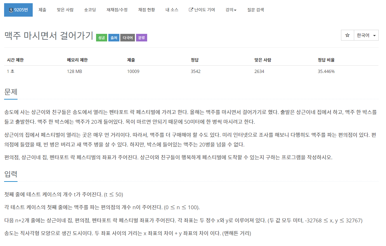 송도에 사는 상근이와 친구들은 송도에서 열리는 펜타포트 락 페스티벌에 가려고 한다. 올해는 맥주를 마시면서 걸어가기로 했다. 출발은 상근이네 집에서 하고, 맥주 한 박스를 들고 출발한다.