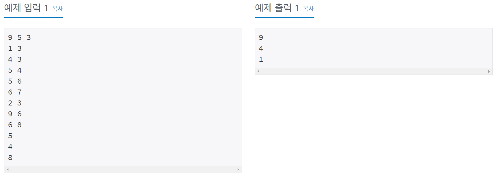 트리의 정점의 수 N과 루트의 번호 R, 쿼리의 수 Q가 주어진다. (2 ≤ N ≤ 105, 1 ≤ R ≤ N, 1 ≤ Q ≤ 105) 이어 N-1줄에 걸쳐, U V의 형태로 트리에 속한 간선의 정보가 주어진다. (1 ≤ U, V ≤ N, U ≠ V)