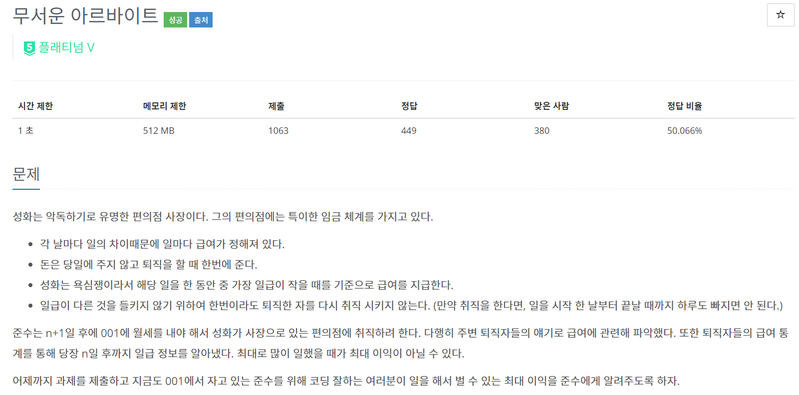 성화는 악독하기로 유명한 편의점 사장이다. 그의 편의점에는 특이한 임금 체계를 가지고 있다. 각 날마다 일의 차이때문에 일마다 급여가 정해져 있다. 돈은 당일에 주지 않고 퇴직을 할 때 한