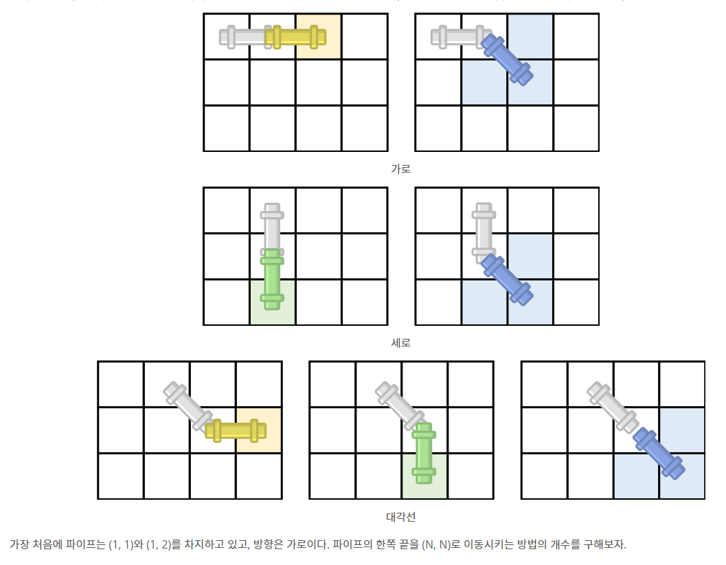 90도 로 움직이는 경우의수를 제외하고 파이프의 끝방향의 좌표를 재귀함수의 인자값으로 넘겨주었다.