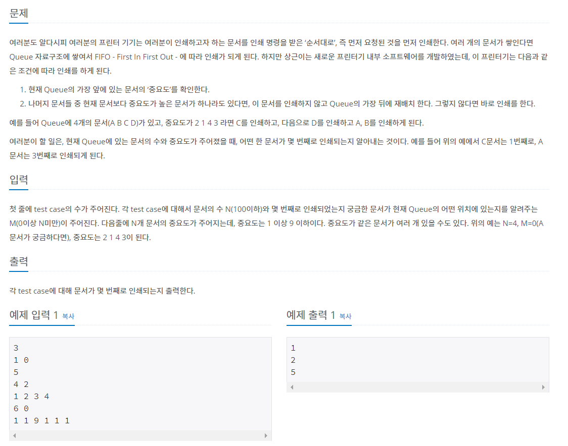 문제 여러분도 알다시피 여러분의 프린터 기기는 여러분이 인쇄하고자 하는 문서를 인쇄 명령을 받은 ‘순서대로’, 즉 먼저 요청된 것을 먼저 인쇄한다. 여러 개의 문서가 쌓인다면 Queue 자료구조에 쌓여서 FIFO - First In First Out - 에 따라 인쇄가 되게 된다. 하지만 상근이는 새로운 프린터기 내부 소프트웨어를 개발하였는데, 이 프린터기는 다음과 같은 조건에 따라 인쇄를 하게 된다. 현재 Queue의 가장 앞에 있는 문서의 ‘중요도’를