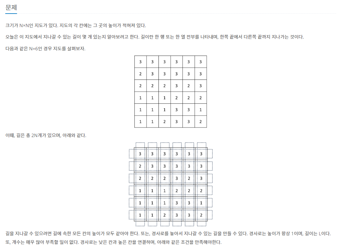 배열을 전진하면서 경사로를 놓을수 있는지 없는지 테스트하는 문제이다.