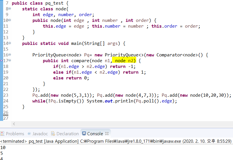 먼저 Pq에는 Node 클래스의 객체가 담긴다고 하자, 우리는 이러한 Node클래스에서 Edge값이 큰 순서대로