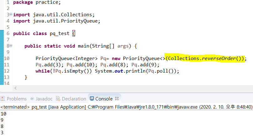 선언은 위와같이하고, Comparator를 따로 선언하지 않고, 자료형이 하나라면 최대힙구조로 구현되었으므로