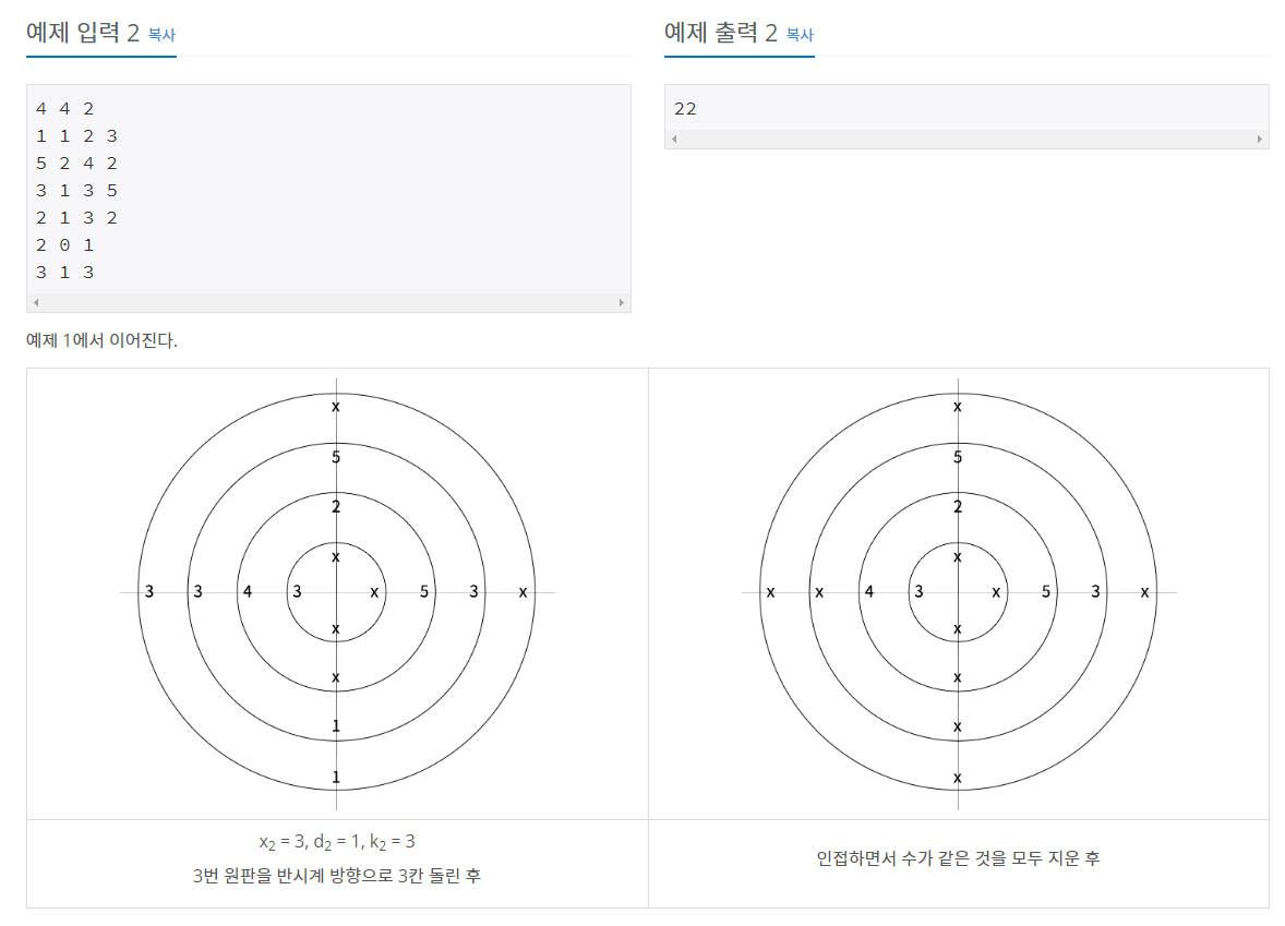 반지름이 1, 2, ..., N인 원판이 크기가 작아지는 순으로 바닥에 놓여있고, 원판의 중심은 모두 같다. 원판의 반지름이 i이면, 그 원판을 i번째 원판이라고 한다. 각각의 원판에는 M개의 정수가 적혀있고, i번째 원판에 적힌 j번째 수의 위치는 (i, j)로 표현한다. 수의 위치는 다음을 만족한다. (i, 1)은 (i, 2), (i, M)과 인접하다. (i, M)은 (i, M-1), (i, 1)과 인접하다. (i, j)는 (i, j-1), (i, j