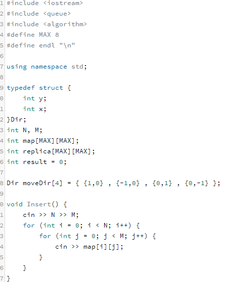 BFS 개념을 사용하기 위하여 큐를 선언한다. 벽이 세워진 후 복제된 배열인 replica 의 정보를 바이러스가 퍼진후의 데이터를 도출하기 위해 spread 행렬에 대입하고, queue 에 바이러스의 위치를 넣는다. 이후, BFS 의 기본 형태에 따라 큐가 완전히 비워질 때 까지 while 문을 반복하여 바이러스가 퍼진후의 배열을 도출하고, 이후 안전영역의 개수를 구하고 max 함수를 사용하여 최고값을 갱신한다.