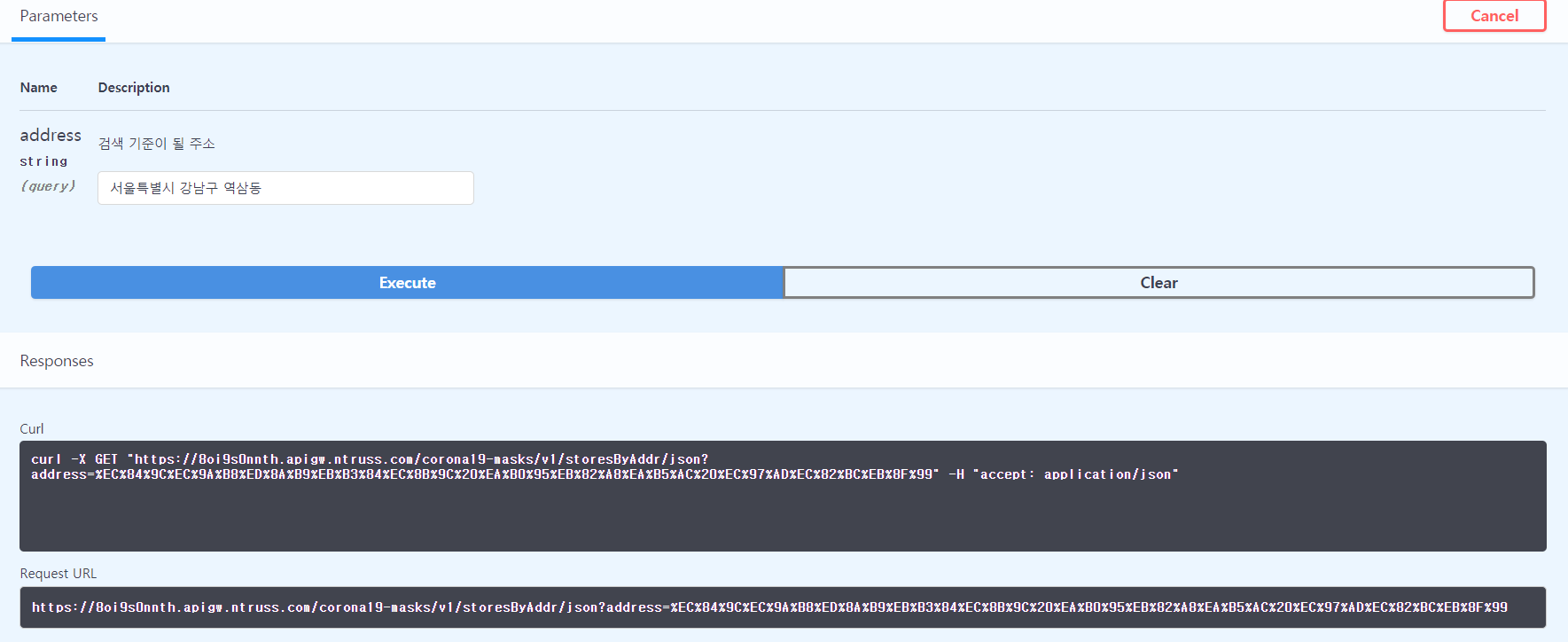 나는 주소를 기준으로 요청을 할 것이기에 storesByAddr을 선택하였고 뒤에는 주솟값을 인코딩한 값이 전달된다.